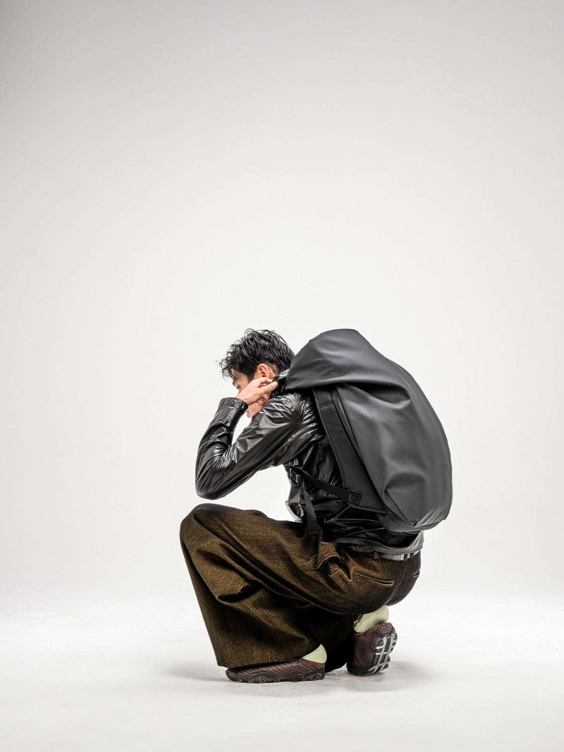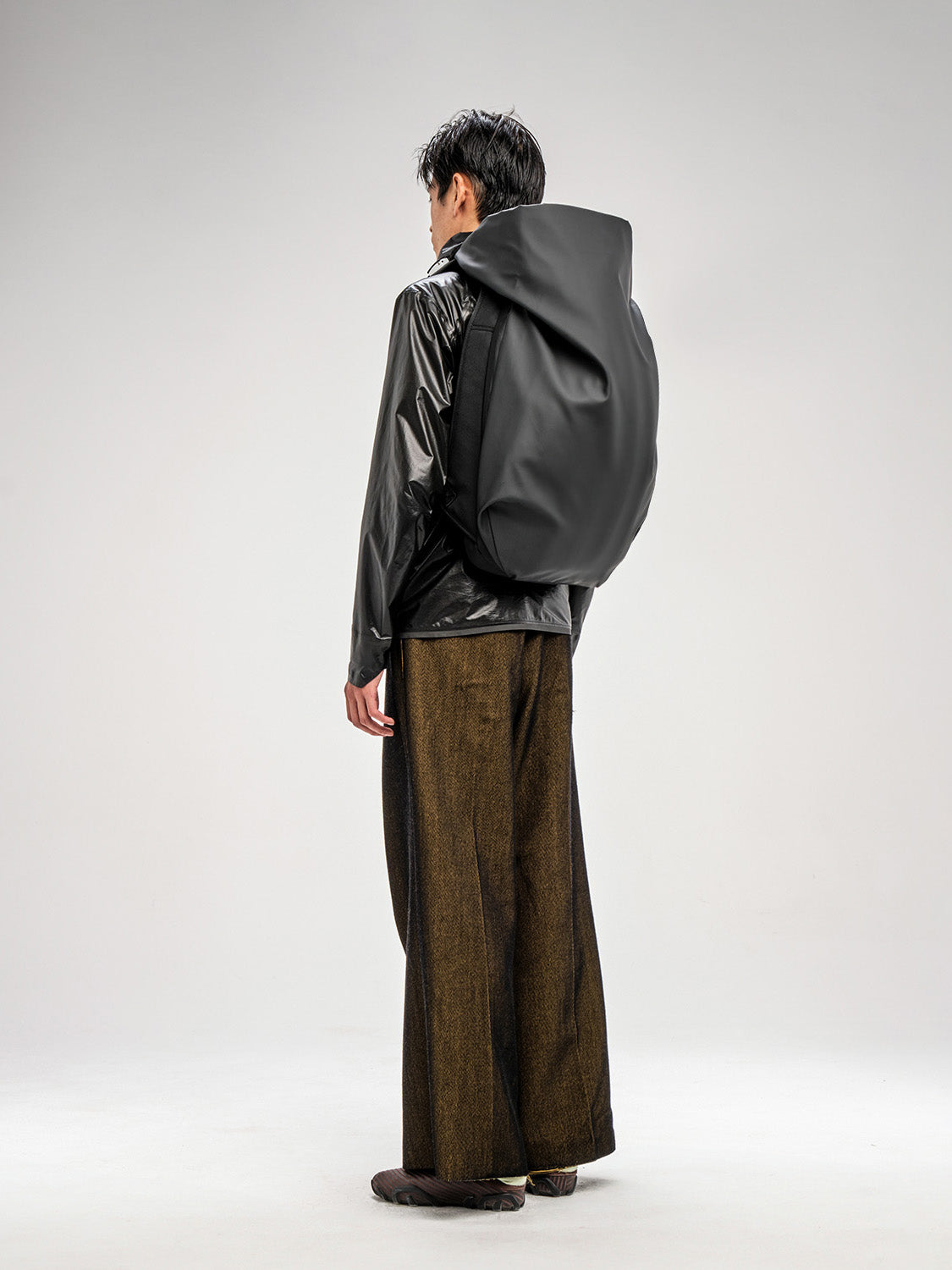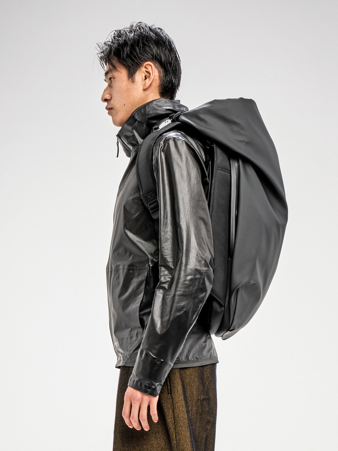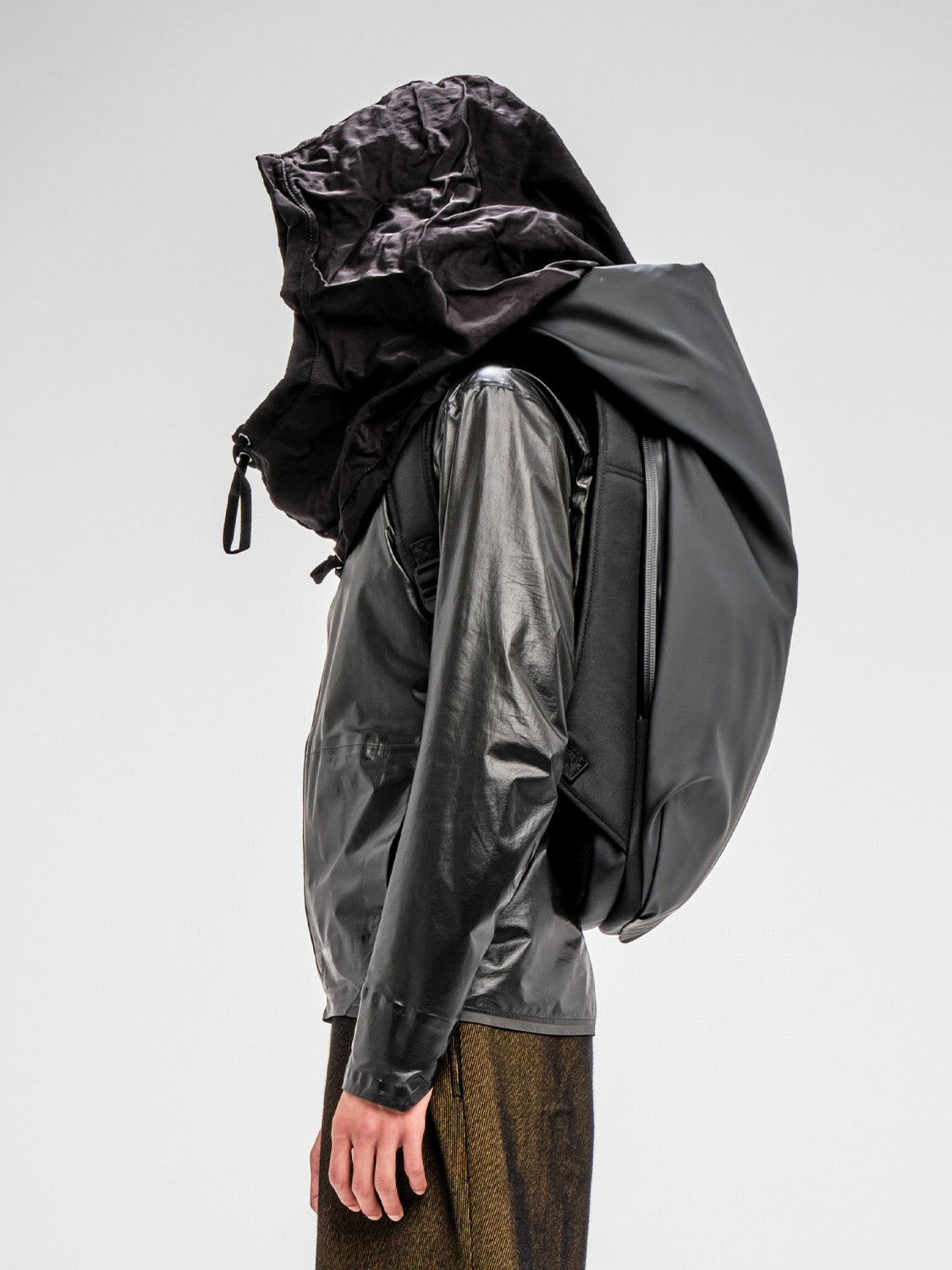 The Nile is a recasting of our iconic Isar rucksack with its complex interplay between form, space and practicality. It effortlessly balances innovative fabrics and an architectural silhouette with a large carrying capacity, and features an integrated rip stop nylon hood.