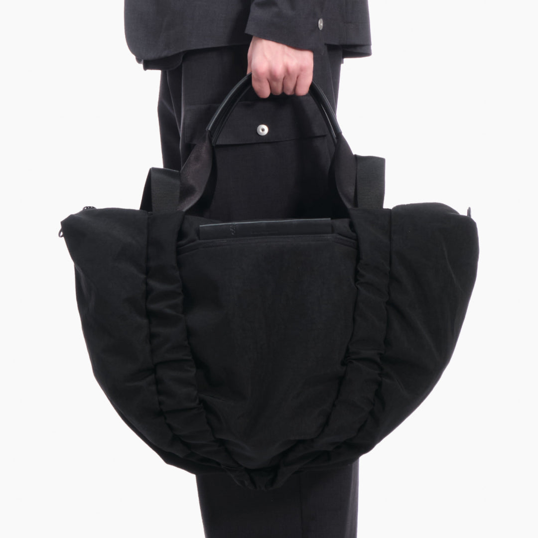 The MINHO weekender bag features gathered ruffle details that can be tailored to shape and expand the bag according to the user's needs. A longer strap offers the option to wear it comfortably on the shoulder, while shorter leather handles add a premium finish.