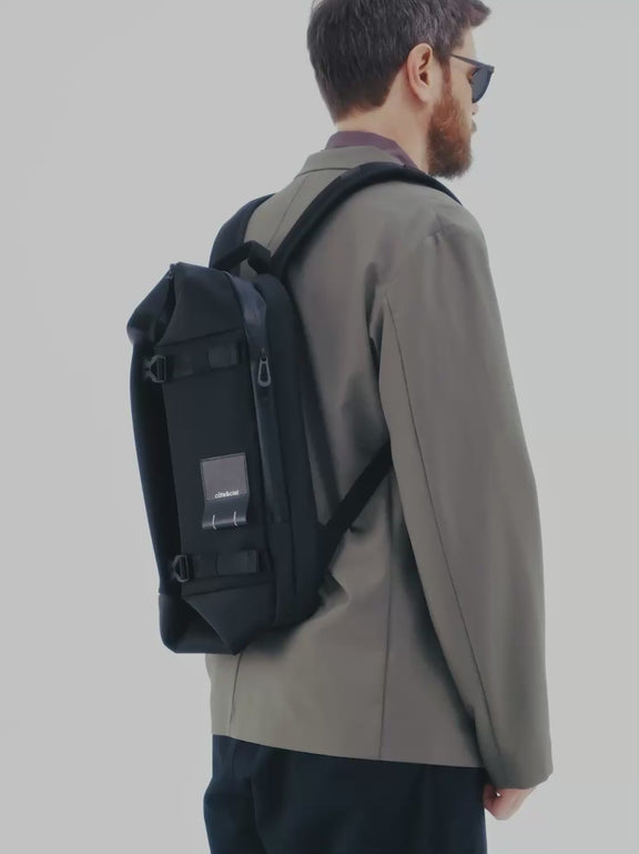 The YUKON returns in our iconic Sleek Black material. A compact backpack with a surprising feature: being able to open the front two buckles allowing the cubic-shaped front compartment to expand to full capacity.
